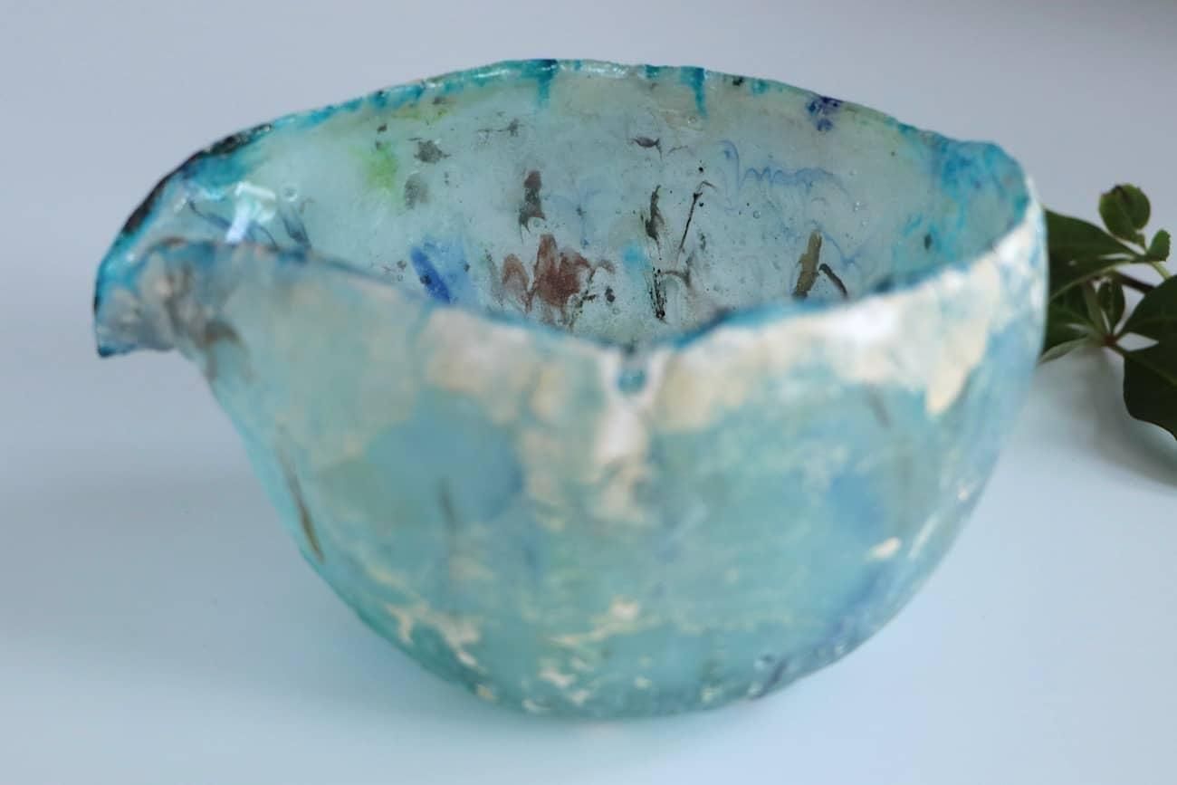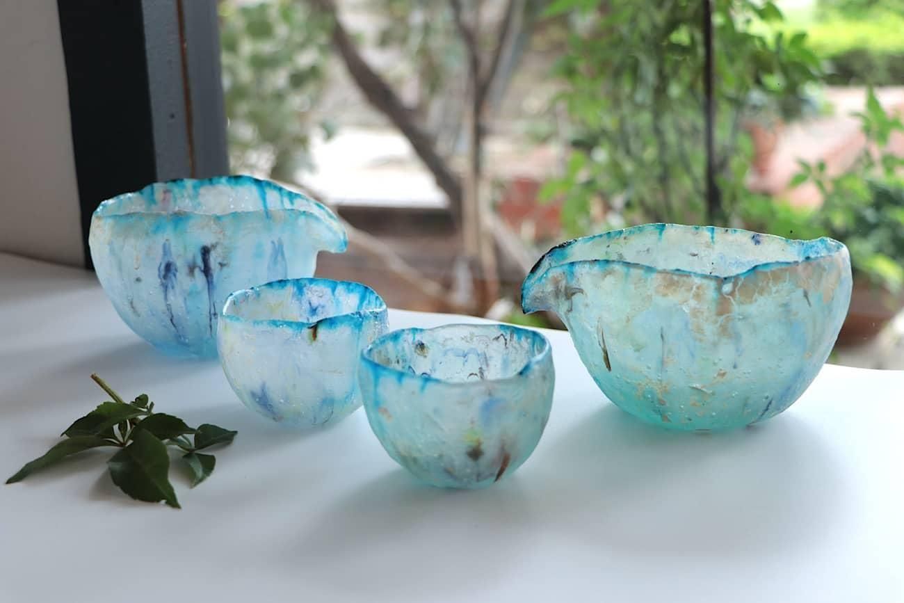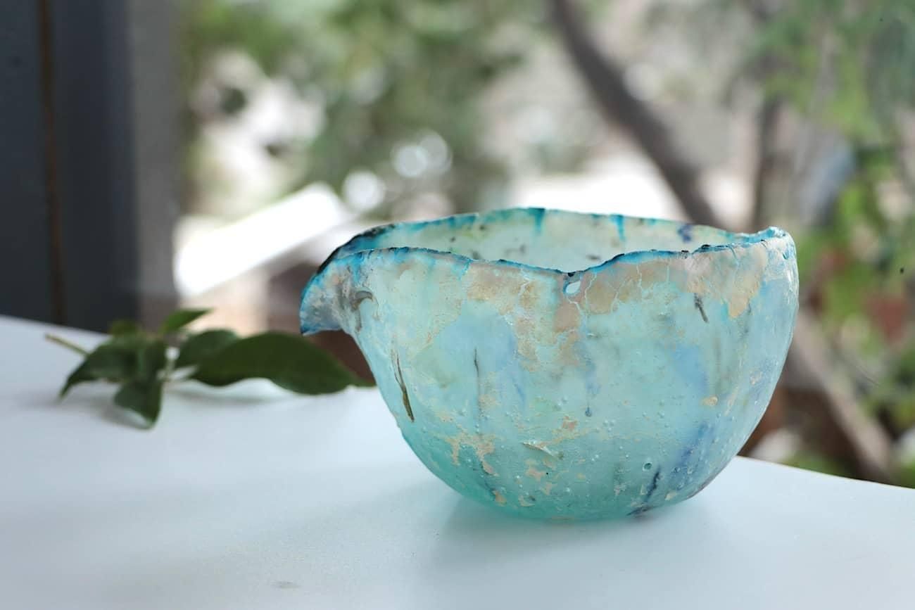 Glass casting is the technique of forming glass shapes by pouring molten glass into gypsum molds, and allowing it to cool and harden. It can create unique glass surfaces, depending on what kind of mold is used, or what materials are mixed with the glass. I intentionally mix different materials with the glass in my works.