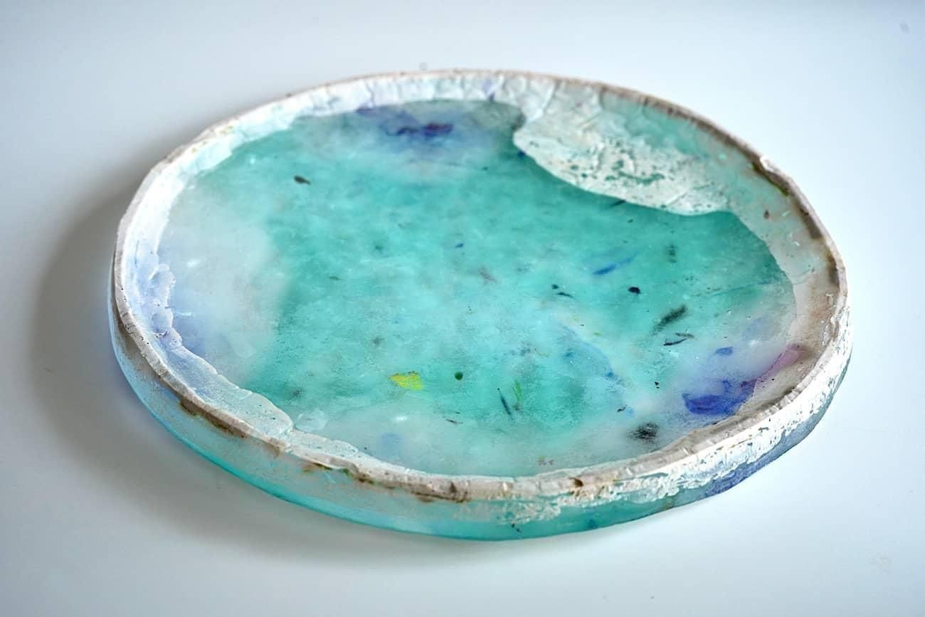 Glass casting is the technique of forming glass shapes by pouring molten glass into gypsum molds, and allowing it to cool and harden. It can create unique glass surfaces, depending on what kind of mold is used, or what materials are mixed with the glass. I intentionally mix different materials with the glass in my works.