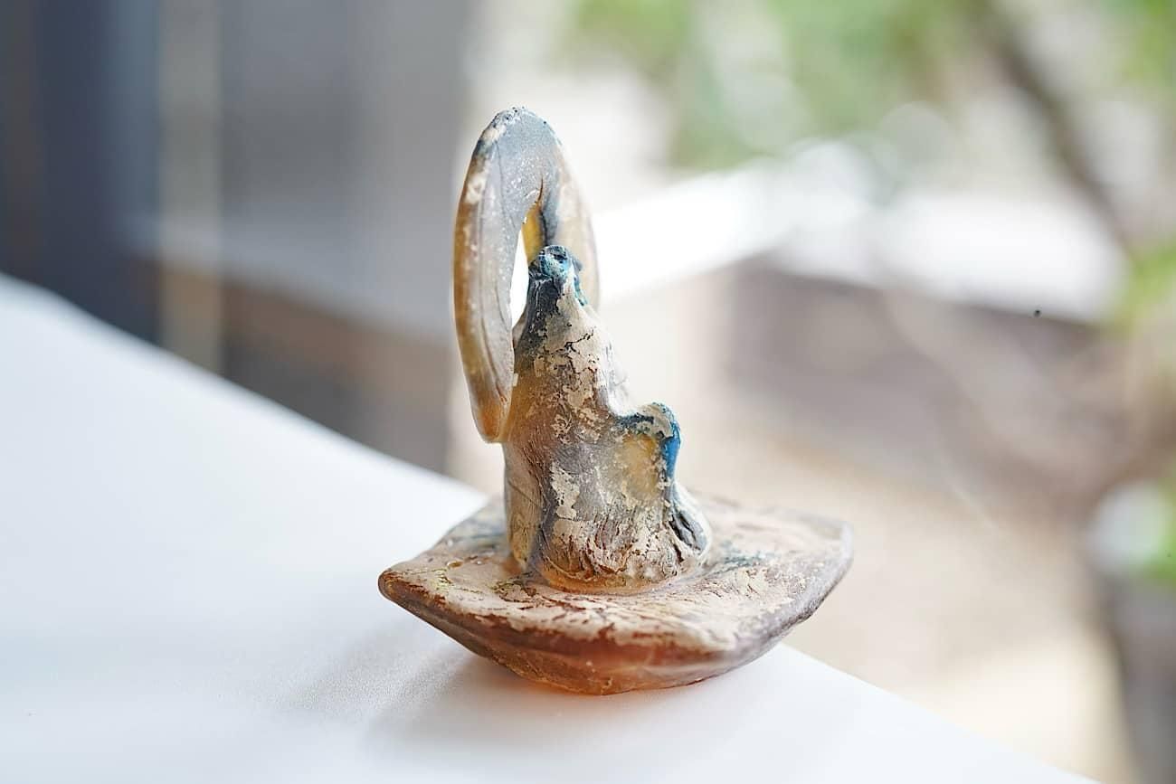 In order to make a gypsum mold, firstly, I figure a shape with wax, according to my own formula. The wax can be difficult to work with, given that it is vulnerable to heat and is not easy to keep cool enough in the summer to shape efficiently. After I make a shape with the wax, I put it in a small box and pour liquid plaster around it.