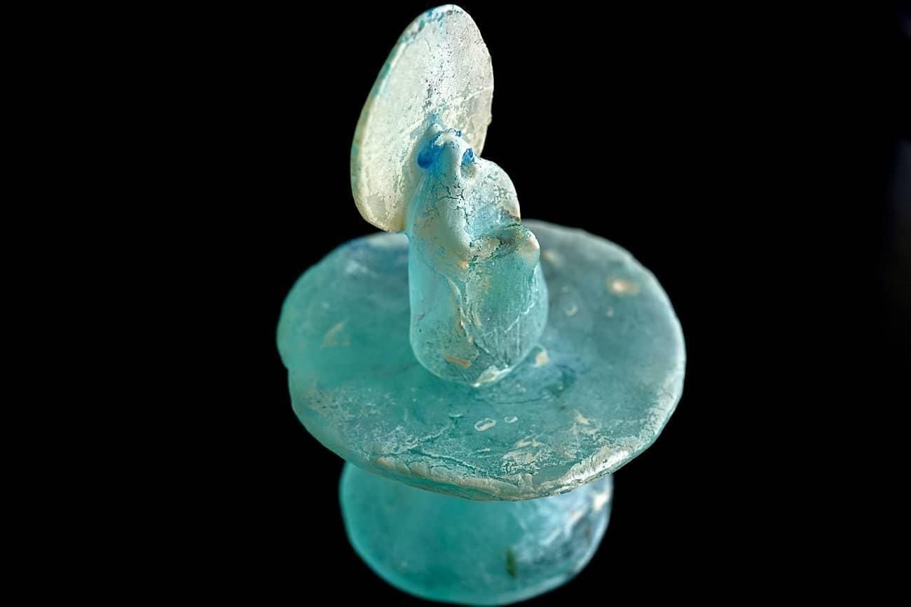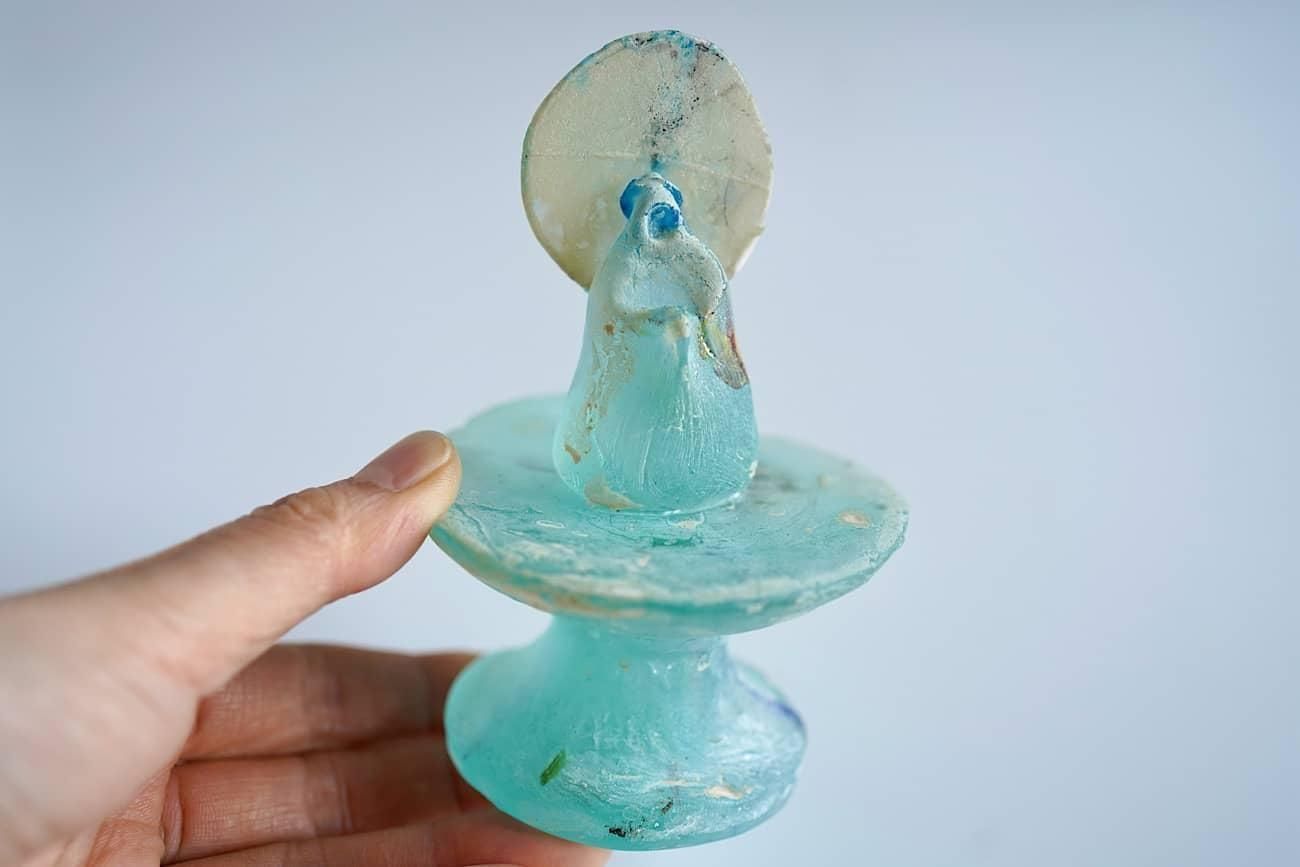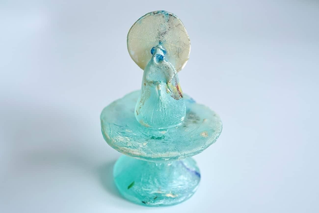 Glass casting is the technique of forming glass shapes by pouring molten glass into gypsum molds, and allowing it to cool and harden. It can create unique glass surfaces, depending on what kind of mold is used, or what materials are mixed with the glass. I intentionally mix different materials with the glass in my works.