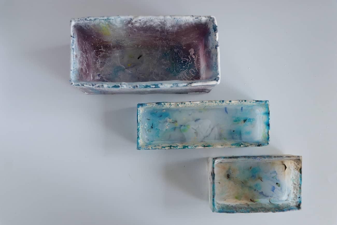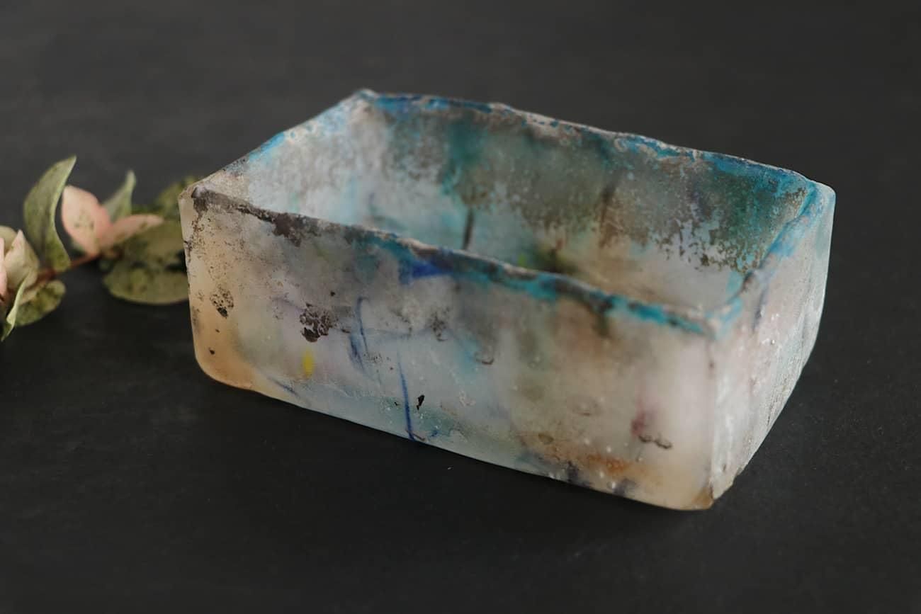 Glass casting is the technique of forming glass shapes by pouring molten glass into gypsum molds, and allowing it to cool and harden. It can create unique glass surfaces, depending on what kind of mold is used, or what materials are mixed with the glass. I intentionally mix different materials with the glass in my works.