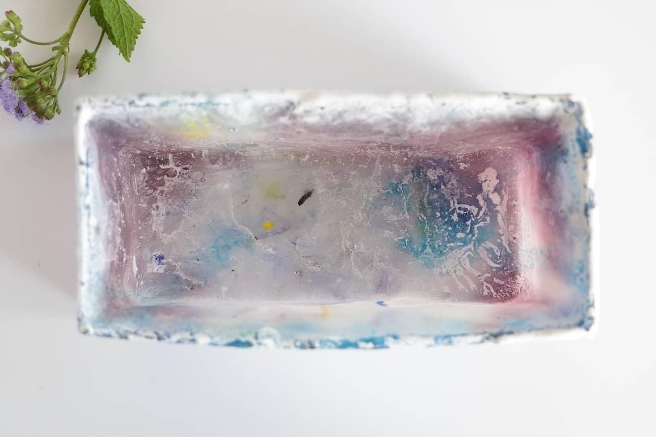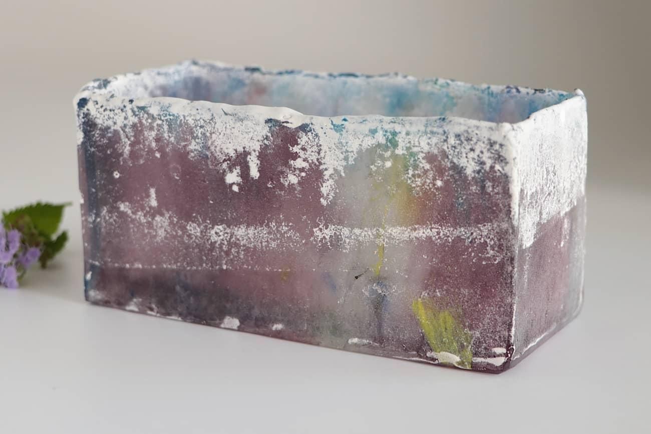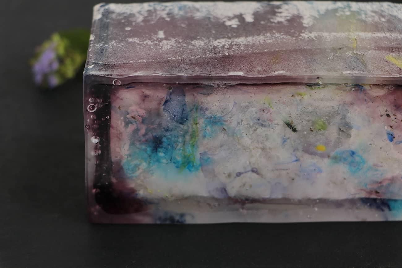 Glass casting is the technique of forming glass shapes by pouring molten glass into gypsum molds, and allowing it to cool and harden. It can create unique glass surfaces, depending on what kind of mold is used, or what materials are mixed with the glass. I intentionally mix different materials with the glass in my works.