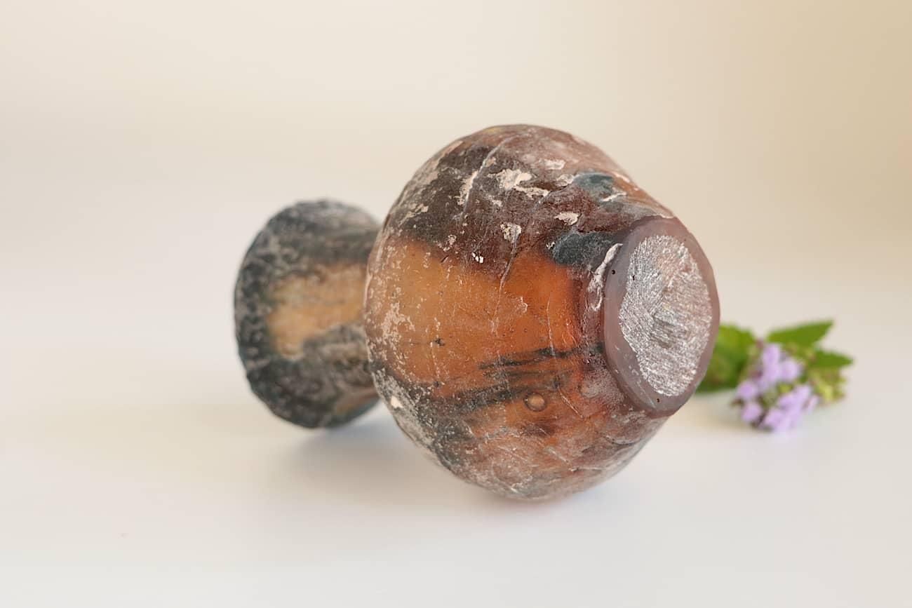 The chemical changes of glass, soil, and metal, when affected by heat, sometimes create unexpected looks. In a way, this could be seen to be a problem, since I am unable to control the look of each piece. However, I find that creating rich expressions in the glass through irregular and unexpected chemical changes, to be more attractive than calculating the change and making my exact plan happen.