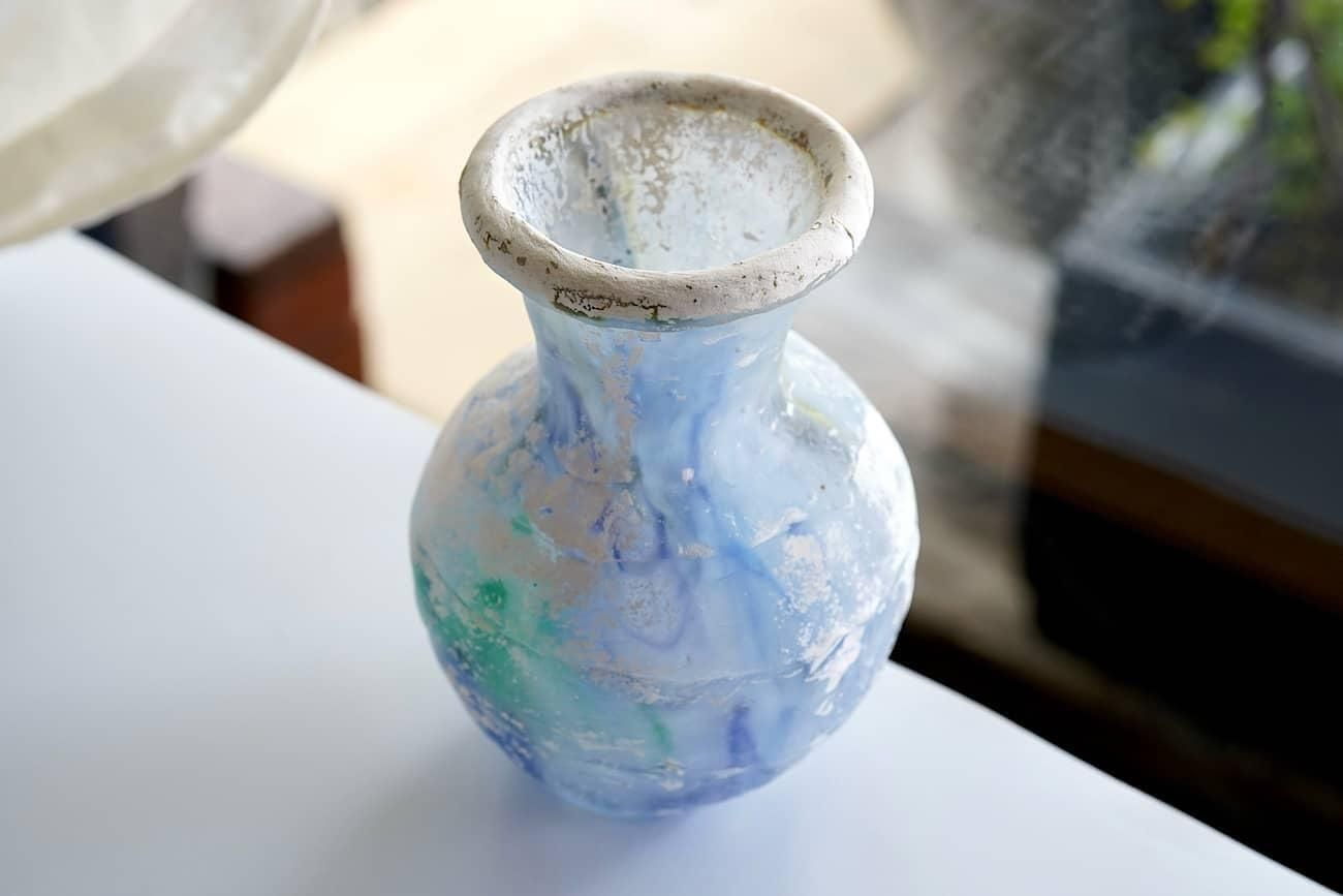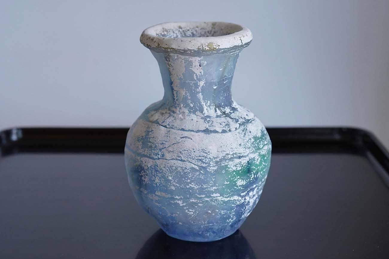 After the plaster hardens, I melt the wax inside and remove it. The gypsum mold is now complete. I then pour molten glass that has been heated to around 1000¡î, soil and metal into the gypsum mold and leave it to cool. After a week to 10 days, I remove the mold and clean the solidified glass. The molds can be used many times; however, when the shape is complicated, such as the shape of a jar, the mold has to be broken to take the solidified glass out. This means that I can use the mold only once and have to make a new one every time I make a new piece. In that case, each piece is one-of-a-kind.