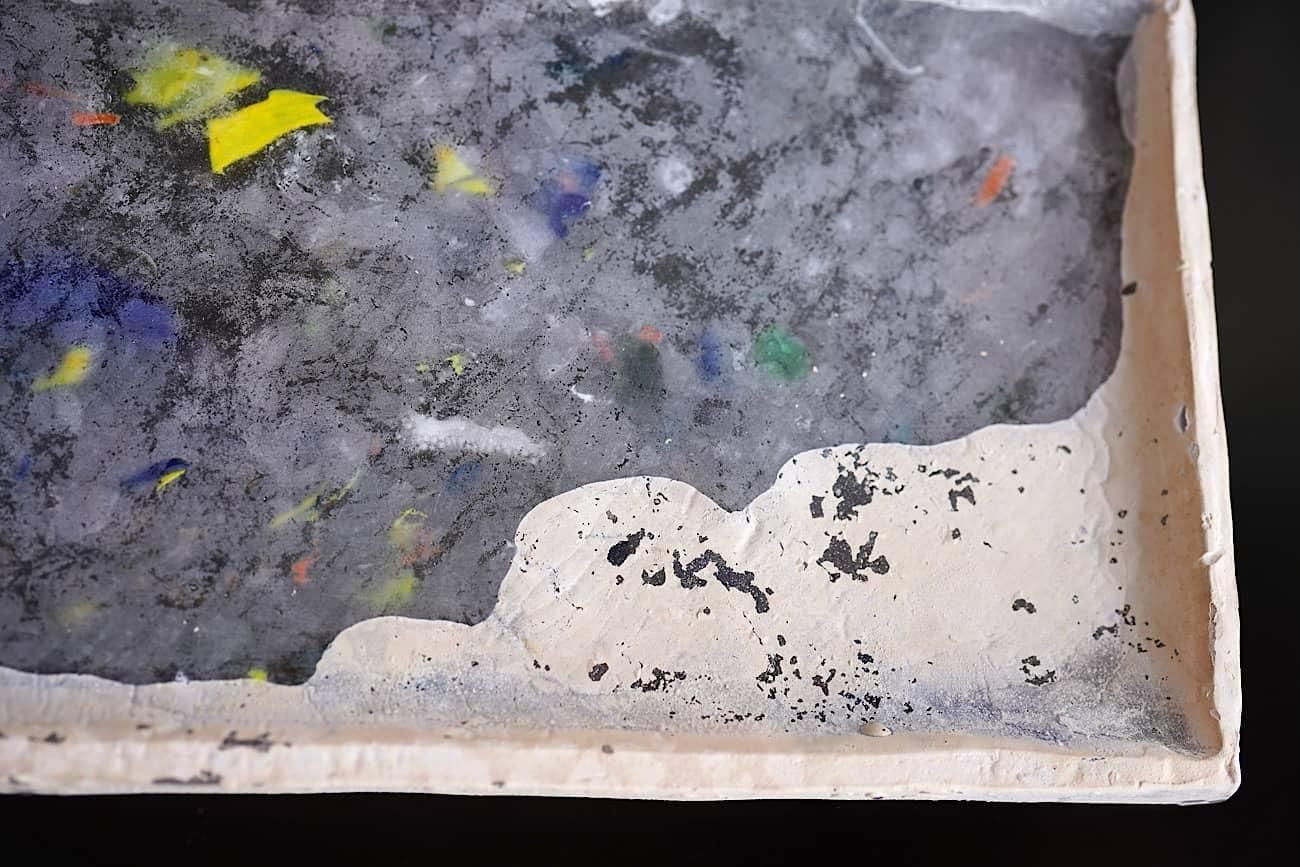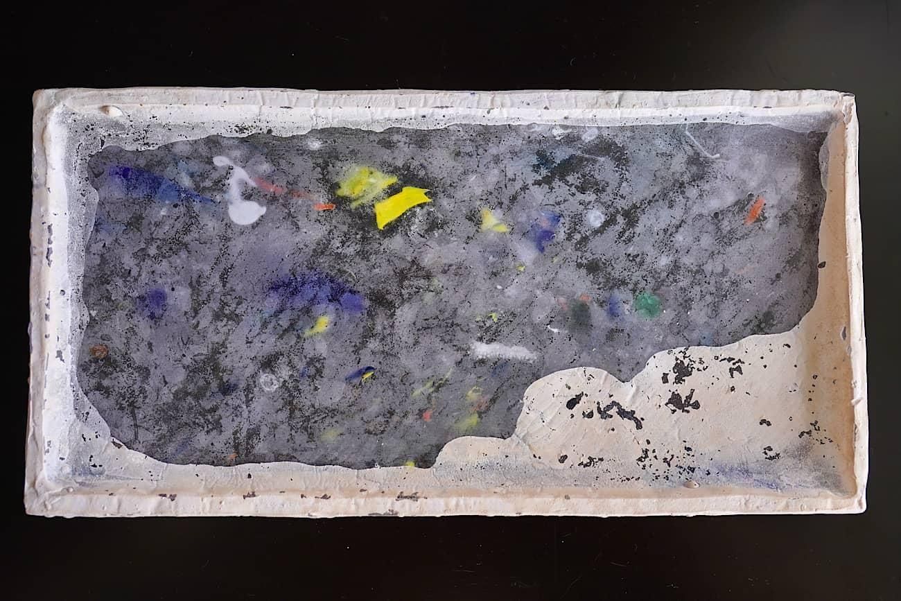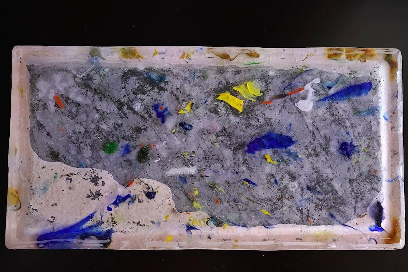 Glass casting is the technique of forming glass shapes by pouring molten glass into gypsum molds, and allowing it to cool and harden. It can create unique glass surfaces, depending on what kind of mold is used, or what materials are mixed with the glass. I intentionally mix different materials with the glass in my works.