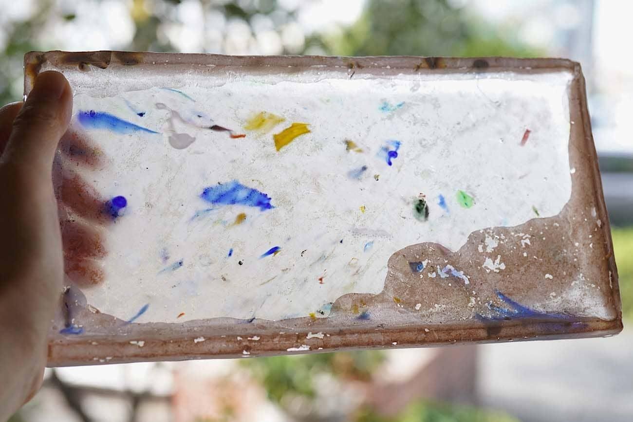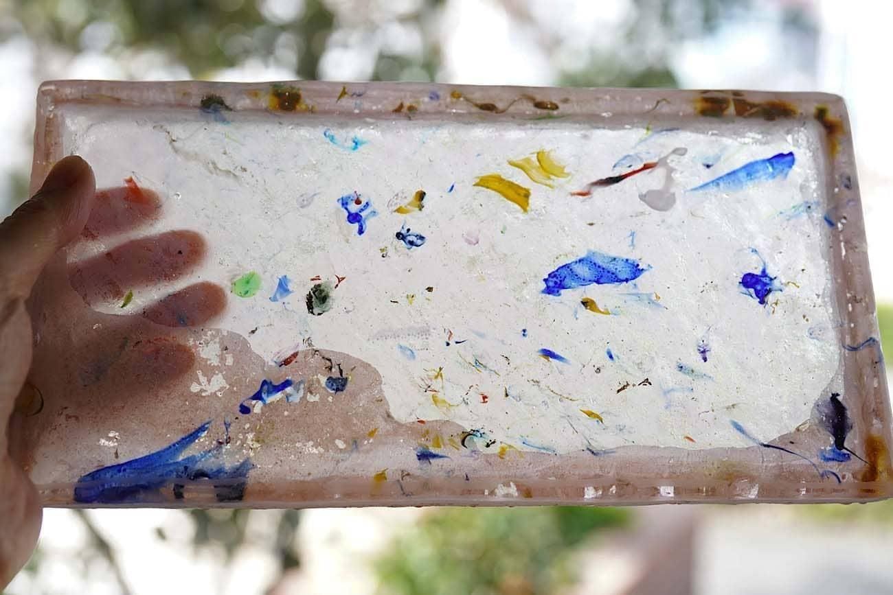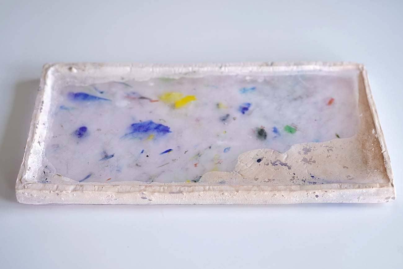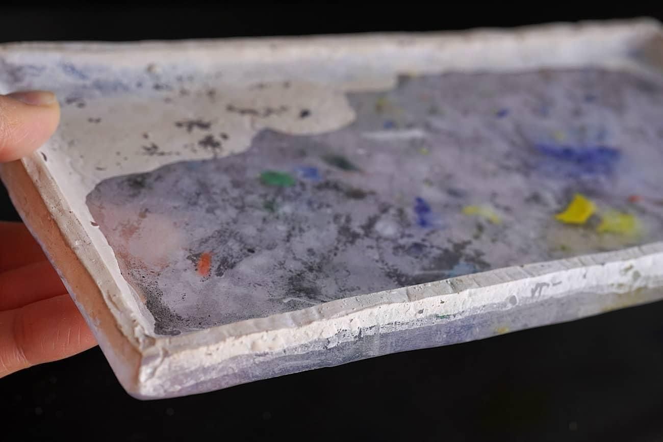 Glass casting is the technique of forming glass shapes by pouring molten glass into gypsum molds, and allowing it to cool and harden. It can create unique glass surfaces, depending on what kind of mold is used, or what materials are mixed with the glass. I intentionally mix different materials with the glass in my works.